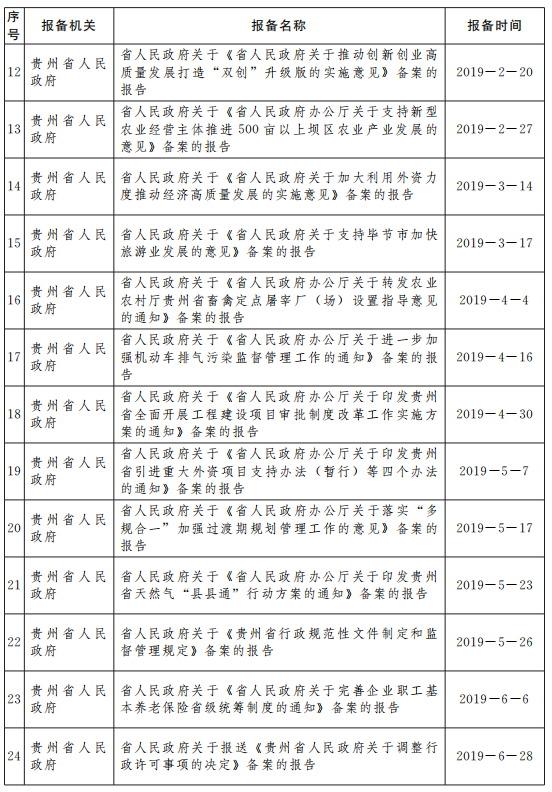 1.规范性文件做到有件必备。截止2019年12月31日,省人大常委会共收到省人民政府、市州人大常委会和市州人民政府报送备案的规范性文件97件。其中:省人民政府报送备案的规章和其他规范性文件31件(规章7件,其他规范性文件24件);市州人民政府报送备案的规章12件(贵阳市9件,遵义市、铜仁市、黔南州各1件);市州人大常委会报送备案的决议决定54件。各报送备案的机关按照“有件必备”的要求,基本做到了报送及时、材料齐全、格式规范,通过报送备案体现了接受省人大常委会监督的主动性和自觉性,报备工作实现了制度化、常态化。
