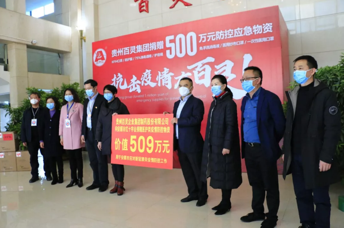 2月13日,贵州百灵疫情防控应急物资捐赠仪式在安顺举行,向安顺市红十字会捐赠了10万只韩国产KF94口罩、50吨75%消毒酒精、1000件防护服、2000副护目镜、1万余瓶免洗手消毒液等防控应急物资,价值509万元人民币。