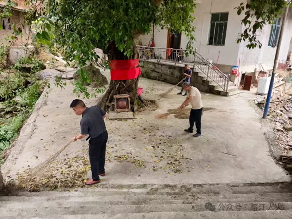 (图为:韦仕江代表带头组织群众打扫环境卫生)