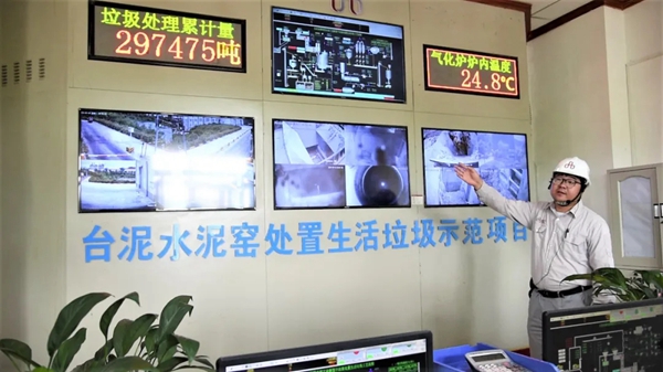 平坝区台泥(安顺)水泥有限公司工程师向检查组介绍水泥窑处置生活垃圾技术
