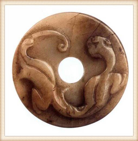 玉璧家族中,有一种比较特殊,称为“出廓璧”,即是在圆璧外缘又附加雕刻一些装饰。收藏界有俗语,“玉璧不出廓,百万无法过”,意思是秦汉玉璧出土较多,只有出廓璧才更加值钱。2000年省考古所在赫章可乐341号墓(土著墓葬),发掘出土一枚“玉玦”,但其整体造型,却好似一面“出廓璧”,其玦四面“出廓”,颇似花冠,因此《贵州文物精华》一书将其定名“璧形带冠玉玦”。璧与玦两种文化内涵,在贵州西部地区,得到完美的融合。