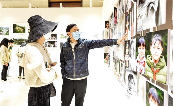 “梭戛故事——一个村庄的影像史”杨安迪纪实摄影展4月20日开展。上图为开展当天的展览现场;左图为杨安迪(右)为观众讲解拍摄故事。
