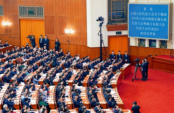 >>2025年3月11日,十四届全国人大三次会议现场掌声雷动,表决通过了新修订的《中华人民共和国全国人民代表大会和地方各级人民代表大会代表法》。 新华社记者 刘大伟/摄