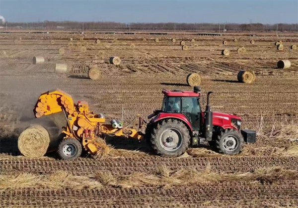 农机手驾驶农机在唐山市丰南区西葛镇的田间将水稻秸秆打包回收。摄影/新华社记者 杨世尧