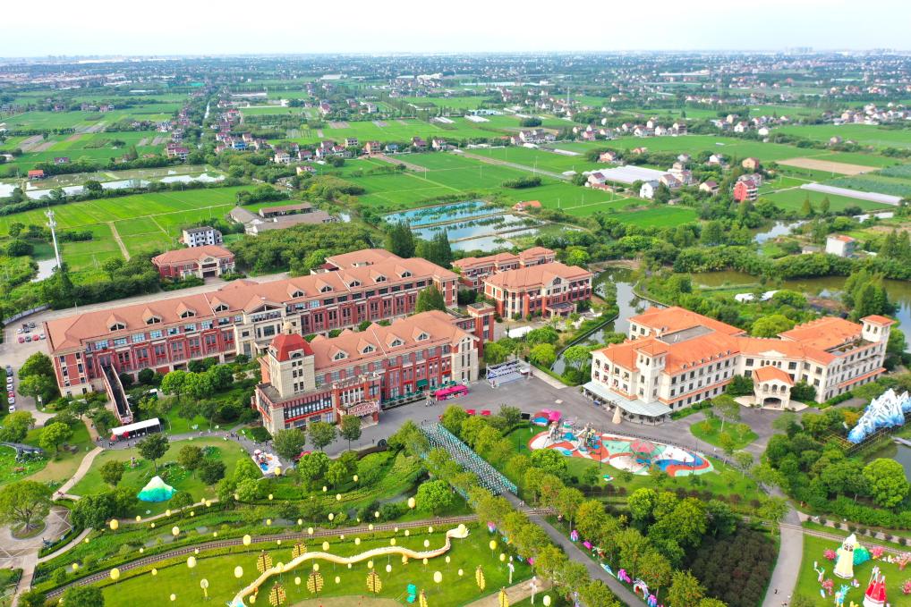 在浙江省嘉兴市嘉善县缪家村拍摄的歌斐颂巧克力小镇(2025年8月7日摄,无人机照片)。新华社记者 毛竹 摄