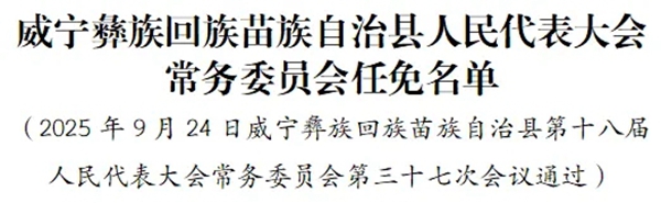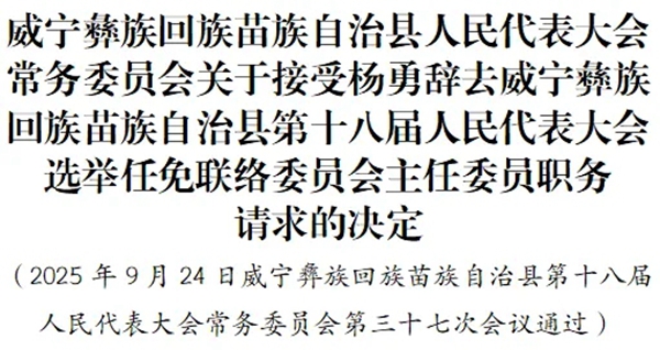 根据《中华人民共和国地方各级人民代表大会和地方各级人民政府组织法》的有关规定,威宁彝族回族苗族自治县第十八届人民代表大会常务委员会第三十七次会议决定:接受杨勇辞去威宁彝族回族苗族自治县第十八届人民代表大会选举任免联络委员会主任委员职务的请求,报威宁彝族回族苗族自治县第十八届人民代表大会第五次会议备案。