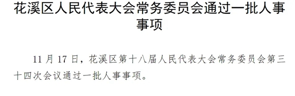 11月17日,花溪区第十八届人民代表大会常务委员会第三十四次会议通过一批人事任免。