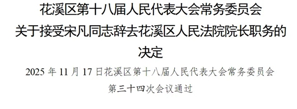 接受宋凡同志辞去花溪区人民法院院长职务的请求,并依法报花溪区第十八届人民代表大会备案。