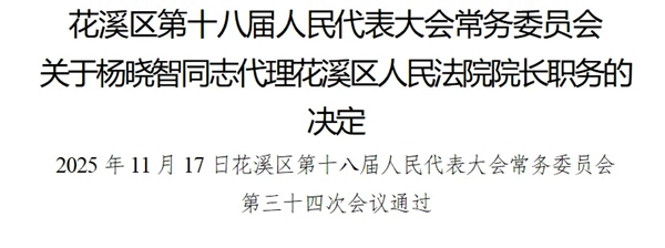 花溪区第十八届人民代表大会常务委员会第三十四次会议审议决定:杨晓智同志代理花溪区人民法院院长职务,并依法报花溪区第十八届人民代表大会备案。