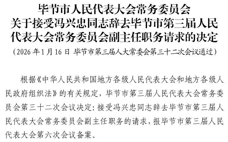 毕节市人民代表大会常务委员会关于接受冯兴忠同志辞去毕节市第三届人民代表大会常务委员会副主任职务请求的决定