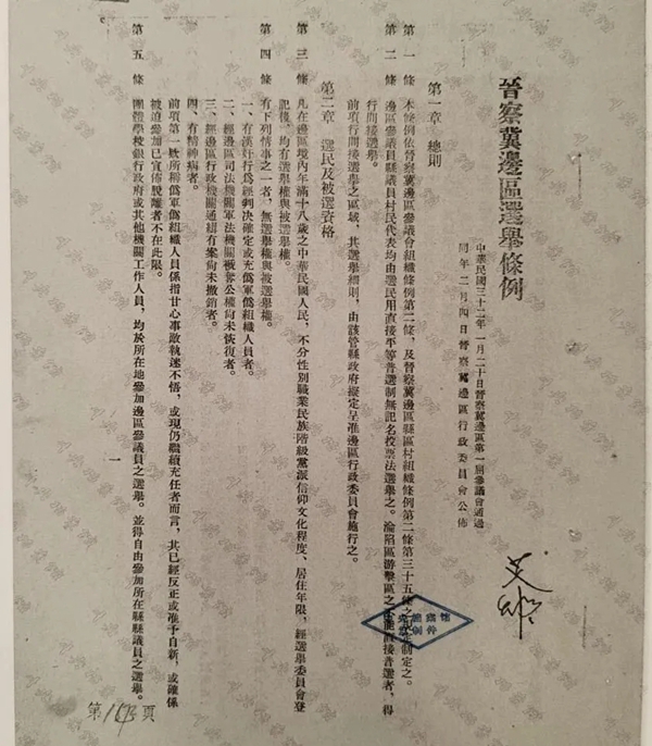 ▲陕甘宁边区的民主选举实践成为革命根据地的模范,随后的《晋察冀边区暂行选举条例》《晋冀鲁豫边区县议员选举条例》等规定,推动民主选举在晋察冀、晋冀鲁豫、晋绥、淮南、苏中等抗日根据地展开。图为1943年1月晋察冀边区第一届参议会通过的《晋察冀边区选举条例》。